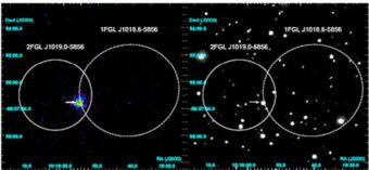 Immagine X (a sinistra) ed ottica (a destra) della regione di incertezza delle sorgente 1FGLJ1018.6-5856. Passando dal primo al secondo catalogo Fermi la “migliore” posizione della sorgente gamma si è spostata e la regione di incertezza è leggermente diminuita. La brillante controparte X, al bordo rispetto alle coordinate 1FGL, ora cade in pieno nella nuova regione di incertezza associata alla migliore posizione