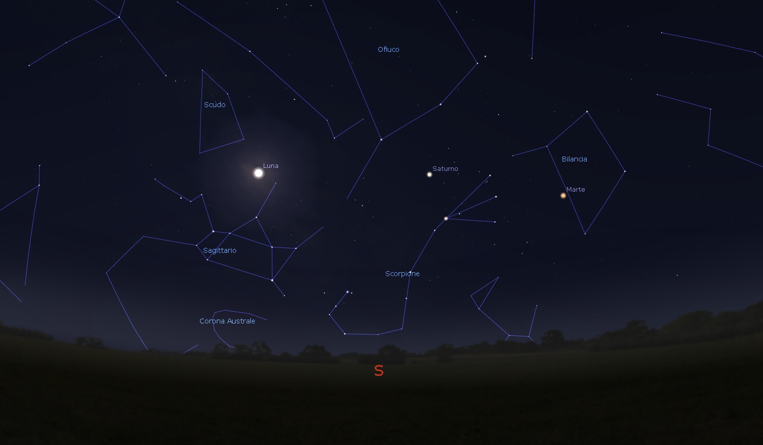 La luna piena come apparirà attorno alla mezzanotte tra il 20 e il 21 giugno prossimi. Ad accompagnarla, verso ovest, i pianeti Saturno e Marte. Crediti: M. Galliani/Stellarium