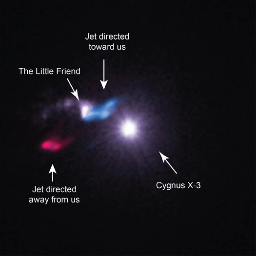 La nube è relativamente piccola, “solo” 0,7 anni luce di diametro, ma – come uno specchio – ha permesso agli astronomi di vedere riflessi i raggi X generati da Cygnus X-3. La nube è stata soprannominata Piccola Amica (Little Friend), perché è una debole fonte di raggi X rispetto alla fonte molto più brillante, cioè il sistema binario. Piccola Amica ha una massa tra 2 e 24 volte quella del nostro Sole e ciò indica che è un globulo di Bok, una piccola ma densa nube di formazione stellare. I dati raccolti dagli 8 radiotelescopi SMA alle Hawaii raccontano anche della presenza di getti dalla nube verso l’esterno, chiaro segnali della presenza di una stella. Con una distanza dalla Terra di 20 mila anni luce, la nube è anche il globulo di Bok più lontano mai studiato (oltre a essere il primo osservato in raggi X). La distanza dalla Terra del sistema binario, invece, è di 24 mila anni luce ed è stata calcolata grazie alle variazioni (di circa 4,8 ore) nell’emissione di raggi X in Cygnus X-3 riflessi dalla nube.