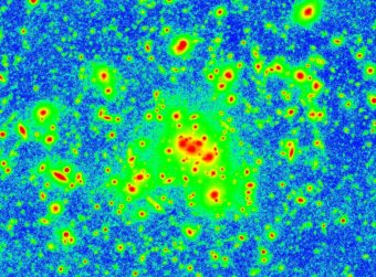 L’Ammasso CL0024+16 ripreso dalla camera LBC del Large Binocular Telescope. La zona centrale in colore verde mostra la distribuzione spaziale della luce diffusa mentre le regioni rosse e gialle indicano la posizione delle galassie con i loro aloni più o meno estesi.