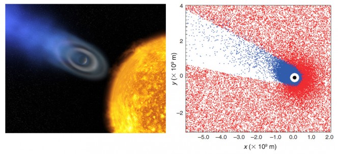 La figura illustra a sinistra l’inviluppo di carbonio e ossigeno e la coda di idrogeno che si diparte da HD 209458b, mentre a destra è rappresentata una sezione del modello 3D della corona d’idrogeno che circonda il pianeta. I puntini blu indicano atomi di idrogeno neutro, quelli rossi atomi di idrogeno ionizzato, inclusi i protoni del vento stellare. Il puntino nero rappresenta il pianeta. Credit: Alfred Vidal-Madjar/Institut d’Astrophysique de Paris (figura a sinistra) – K. Kislyakova et al. 2014 (figura a destra).