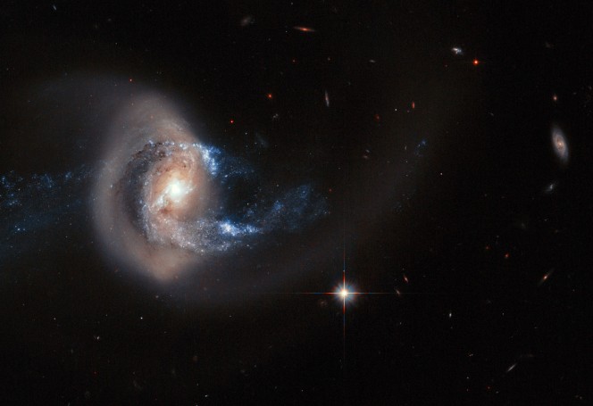 La galassia a spirale NGC 7714 si trova a 100 milioni di anni luce dalla Terra: è la protagonista di un violento scontro con la sua piccola compagna NGC 7715, in alto nell’immagine. Credit: ESA, NASA, A. Gal-Yam (Weizmann Institute of Science)