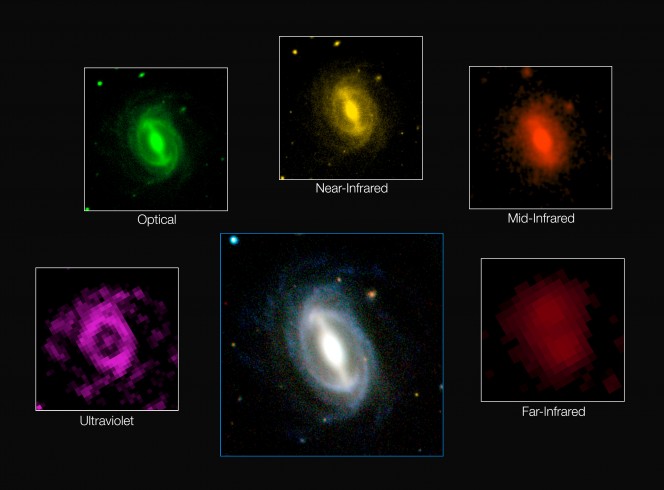 La figura illustra come appare una galassia tipica a diverse lunghezze d’onda nella survey GAMA. Credit: ICRAR/GAMA and ESO