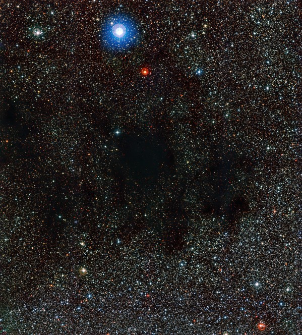 Chiazze scure cancellano quasi completamente le stelle da un pezzetto di cielo, in questa immagine catturata dalla camera WFI (Wide Field Imager), installata sul telescopio da 2,2 metri dell’MPG/ESO all’Osservatorio dell’ESO di La Silla in Cile. Le zone nere come l’inchiostro fanno parte di un’enorme nebulosa oscura nota come il Sacco di Carbone, uno degli oggetti di questo tipo più facilmente visibili a occhio nudo. Tra milioni di anni, alcuni brandelli della Nebulosa si accenderanno, un po’ come l’omonimo combustibile fossile, grazie al bagliore di molte giovani stelle.