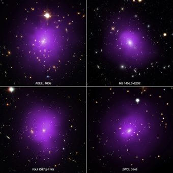 Combinando immagini in banda X riprese dall’Osservatorio per raggi X Chandra della NASA con immagini in banda ottica scattate da Hubble e dalla Sloan Digital Sky Survey su quattro degli ammassi interessati dalla survey, è stata realizzata l’immagine che vedete in apertura. I quattro ammassi fanno parte di un ampio monitoraggio effettuato su oltre 300 cluster di galassie per indagare la dark energy, quella misteriosa energia con cui i cosmologi spiegano l’espansione accelerata dell’universo alla base del modello standard lambda-CDM.