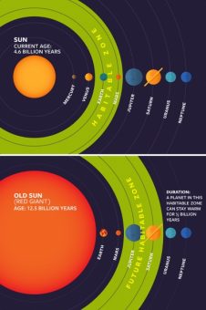 In base alla massa originale della stella, lune e pianeti possono aggirarsi lungo la fascia abitabile d’una gigante rossa anche per 9 miliardi di anni. La Terra, per esempio, risiede in zona abitabile da circa 4,5 miliardi di anni, durante i quali ha brulicato in essa ogni possibile forma di vita. Ma nel giro di qualche miliardo di anni il Sole diventerà anch’esso una gigante rossa, inghiottendo Mercurio e Venere, trasformando la Terra e Marte in pianeti rocciosi sfrigolanti, e scaldando quei mondi lontani – come Giove, Saturno, Nettuno e le loro lune – che verranno a trovarsi in quella che sarà la nuova zona abitabile.