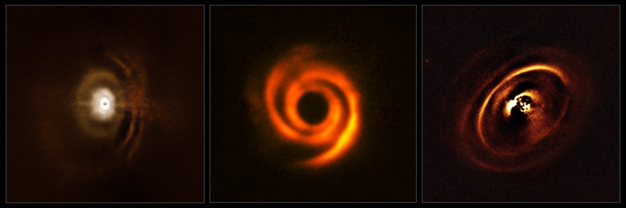 Questi tre dischi planetari sono stati osservati con lo strumento. La zona centrale appare scura nelle immagini perché SPHERE blocca la luce della stella centrale per rivelare le strutture molto più deboli che la circondano. Crediti: ESO