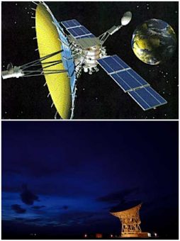 I due radiotelescopi protagonisti della misura da primato: in alto, il satellite russo RadioAstron, in basso, l’antenna di Medicina dell’Inaf di Bologna