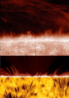 Sul limbo del Sole, una selva di getti si stagliano nell’immagine in alto della sequenza, presa dallo spettrografo della missione spaziale Iris della Nasa. Nel pannello centrale, la ricostruzione delle spicole prodotta dal modello al calcolatore realizzato dal team di ricercatori. Nel pannello in basso, la ripresa dello Swedish Solar Telescope al Roque de los Muchachos (La Palma, Spagna) mostra i getti di plasma al centro del disco solare, organizzati in strutture filiformi e di breve durata. Crediti: Nasa-Iris, Università di Oslo, Swedish Solar Telescope
