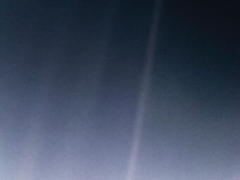 L’iconica immagine “pallido punto blu” scattata dalla sonda Voyager nel 1990. Mostra la Terra, visibile come un minuscolo punto all’interno di una delle strisce, da una prospettiva astronomica unica: un pianeta abitabile relativamente piccolo rispetto all’ambiente ostile dello spazio. Le strisce sono causate dalla luce solare dispersa che penetra nella fotocamera. Crediti: Nasa
