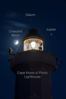 La scena risale al 19 novembre scorso. «Eravamo in prossimità dell’allineamento fra Giove e Saturno con la Luna crescente», rammenta Saragozza, «e ho deciso di dirigermi in un luogo che mi ha sempre emozionato, sin da piccolo: il Plemmirio. Oasi dove riesco a percepire un’energia ineguagliabile, tanta pace che rigenera l’anima. Ricordo ancora quando, dalla mia villa, guardavo la Luna e i pianeti con il vecchio telescopio di mio fratello maggiore. In questa’immagine ho voluto unire la mia grande passione – l’astrofotografia – a un elemento chiave di questo fantastico luogo, il faro Capo Murro di Porco».