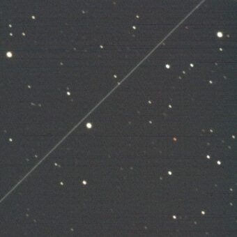 La traccia di un satellite Starlink (la linea che parte dall’alto a destra, verso il basso a sinistra) catturata dal Telescopio Murikabushi il 10 aprile 2020. Crediti: Naoj