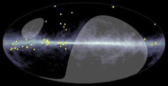 I raggi gamma diffusi ad altissima energia (punti gialli) sono distribuiti lungo la Via Lattea. Il contorno del colore di sfondo mostra la distribuzione dell’idrogeno atomico in coordinate galattiche. L’area grigia ombreggiata indica ciò che si trova al di fuori del campo visivo. Crediti: Heasarc / Lambda / Nasa / Gfsc