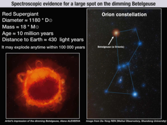 La temperatura era di 3476 kelvin il 31 gennaio 2020, per poi risalire fino a raggiungere 3646 kelvin il successivo 6 aprile. La ricercatrice sostiene che questo cambiamento di temperatura basti per spiegare il sorprendente oscuramento. Secondo gli autori, l’unica ipotesi percorribile è quella di una grande macchia stellare sulla superficie di Betelgeuse, all’origine di un calo di temperatura di 170 kelvin che, a sua volta, ha causato l’affievolimento dell’astro.