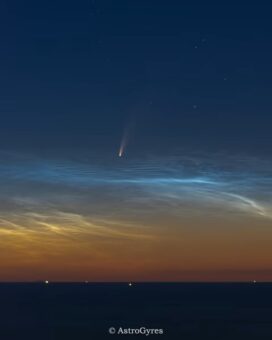 «Vederla sorgere è stato molto emozionante, anche perché era la prima volta che vedevo una cometa a occhio nudo. Man mano che si alzava, superando la foschia dell’orizzonte, diventava sempre più luminosa, fino a che non ci siamo resi conto che qualcos’altro stava accadendo: enormi nubi nottilucenti ondeggiavano imponenti e colorate, illuminate dal Sole ancora molto sotto l’orizzonte. Quindi, due prime volte nella stessa mattina, ero contentissimo: la levataccia era valsa la pena. Quando osservo fenomeni astronomici mi piace sempre pensare e immaginare le distanze in gioco. Il mare a pochi metri, le nubi a 100 km, la cometa a 150 milioni di km, le stelle a decine di anni luce. Mi aiuta a mettere le cose nella giusta prospettiva e a ridimensionare i piccoli problemi che abbiamo nella vita di tutti i giorni».