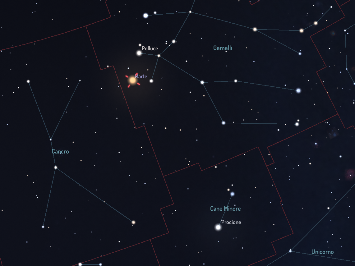 Marte in opposizione il giorno 16 gennaio 2025 ben visibile per tutta la notte tra la costellazione del Cancro e quella dei Gemelli