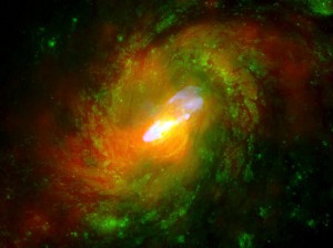 Soffia alla spaventosa velocità di oltre un milione di chilometri orari, una furia al cui confronto l’uragano Katrina sembrerebbe un soffio di fiato. È l’eccezionale vento generato dal buco nero che si trova al centro di una galassia relativamente vicina alla Via Lattea, NGC 1068, distante 50 milioni di anni luce. Per la prima volta, questa mostruosa corrente, in grado di spazzare il gas interstellare per distante gigantesche e modificare i contorni della galassia stessa, è stata fotografata, combinando le foto di tre telescopi. La struttura a spirale della galassia, con il gas che viene spinto via dal vento, è il risultato delle immagini ai raggi X rilevata dal telescopio spaziale Chandra (in rosso), delle immagini nell’ottico prese dal telescopio spaziale Hubble (in verde) e delle elaborazioni dei segnali radio catturati dai radiotelescopi del Very Large Array, nel Nuovo Messico (in blu).