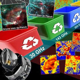 Planck è stato progettato e lanciato per studiare il background, ovvero il fondo cosmico a microonde, la fotografia dei primi istanti dell’universo. Ma per ricostruire una fotografia accurata, tutto ciò che fondo non è—e che a esso si sovrappone: appunto, i foreground—dev’essere scrupolosamente sottratto. Attività, questa, che ha un nome ben preciso: component separation (separazione delle componenti). Una sorta di “raccolta differenziata” che a Planck riesce egregiamente, grazie alle nove frequenze del suo mosaico di ricevitori, divisi in due strumenti: LFI, finanziato dall’Agenzia Spaziale Italiana e realizzato da un consorzio internazionale sotto la guida di Reno Mandolesi dell’INAF-IASF Bologna, per le frequenze da 30 a 70 GHz; HFI, a guida francese, per le frequenze dai 100 agli 857 GHz.