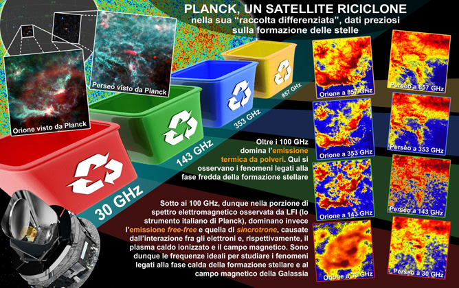 Informazioni come quelle fornite dalle nuove immagini raccolte da Planck di due regioni di formazione stellare relativamente vicine, Orione e Perseo, entrambe nella nostra galassia. «Per la prima volta», dice Gianfranco De Zotti, astronomo ordinario presso l’INAF-Osservatorio astronomico di Padova, «abbiamo una visione globale di tutta la complessità dei fenomeni che sono coinvolti nel processo di formazione di nuove stelle. Un processo ancora assai poco conosciuto, perché dipende da un insieme di fenomeni fisici estremamente difficili da individuare e da ricostruire in modo adeguato».