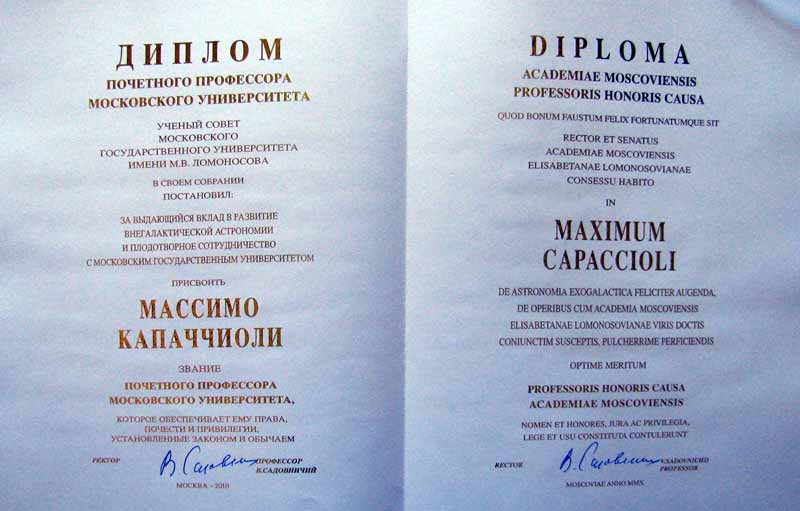 Il primo, e più importante, è quello che gli ha conferito il 24 giugno scorso, davanti a 1500 persone, l’Università statale di Mosca Lomonosov: la professorship ad honorem. Un riconoscimento che giunge da un’istituzione prestigiosa—all’Università statale di Mosca hanno insegnato scienziati del calibro di Landau e Kolmogorov—e per il quale Capaccioli non nasconde una profonda soddisfazione: «È arrivato dopo una dura selezione durata tre anni. E la prima domanda che il rettore della Lomonosov ha posto a coloro che mi avevano proposto è stata: “Ma ce l’ha il Premio Nobel?”. Perché di solito – ma ahimé non è questo il caso – è a chi già ha il Nobel che viene dato».
