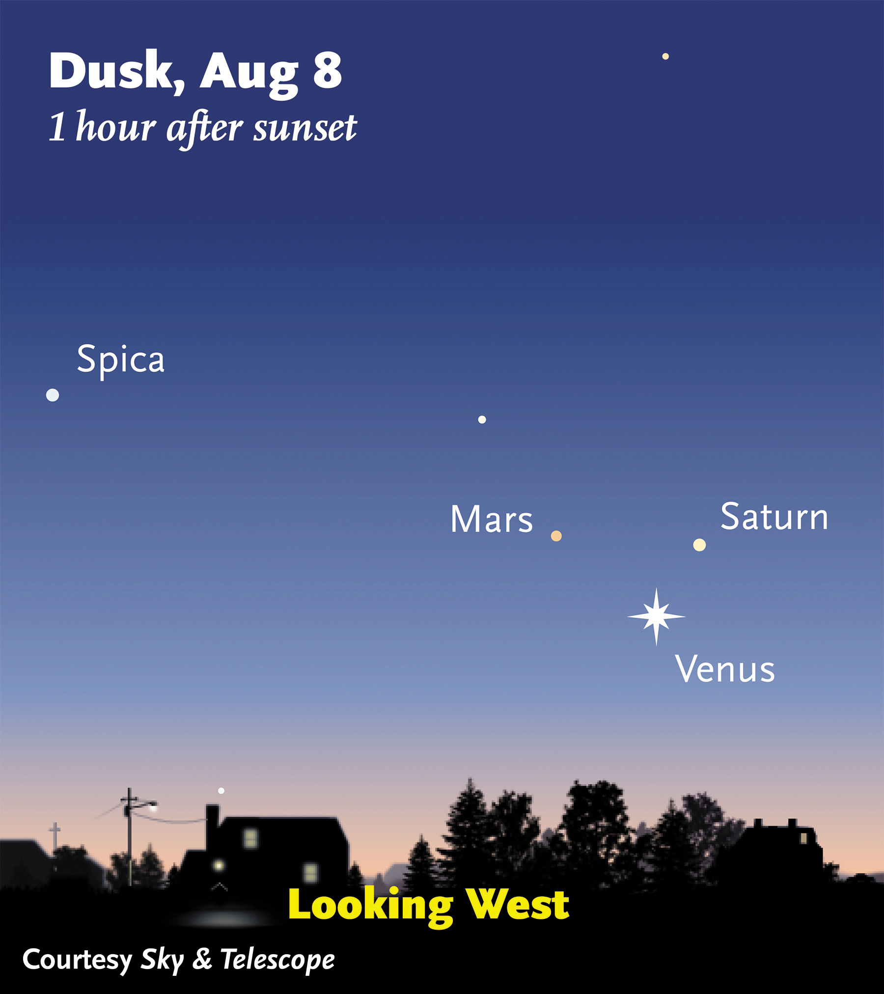 Venere, l’oggetto più brillante in cielo dopo il Sole e la Luna, balza subito agli occhi. Per vedere anche Marte e Saturno, circa cento volte meno luminosi, può essere necessario attendere fino a che il cielo non si sarà fatto un po’ più buio. Ma prima o poi emergeranno anche loro, quasi in orizzontale sopra al brillante compagno.