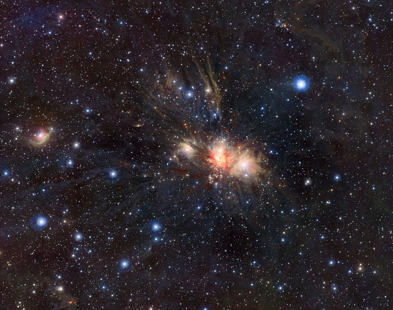 R2 Monoceros ha un nucleo denso, che misura per ampiezza non più di due anni-luce, un vero e proprio calderone di giovani stelle molto massicce, così come un insieme di sorgenti intense di raggi infrarossi, che in genere sono stelle massicce appena nate, ancora circondate dai dischi di polvere dalle quali hanno origine. Questa regione si trova al centro dell’immagine, dove è visibile una maggiore concentrazione di stelle e dove le caratteristiche strutture rossastre prominenti indicano emissioni di idrogeno molecolare.