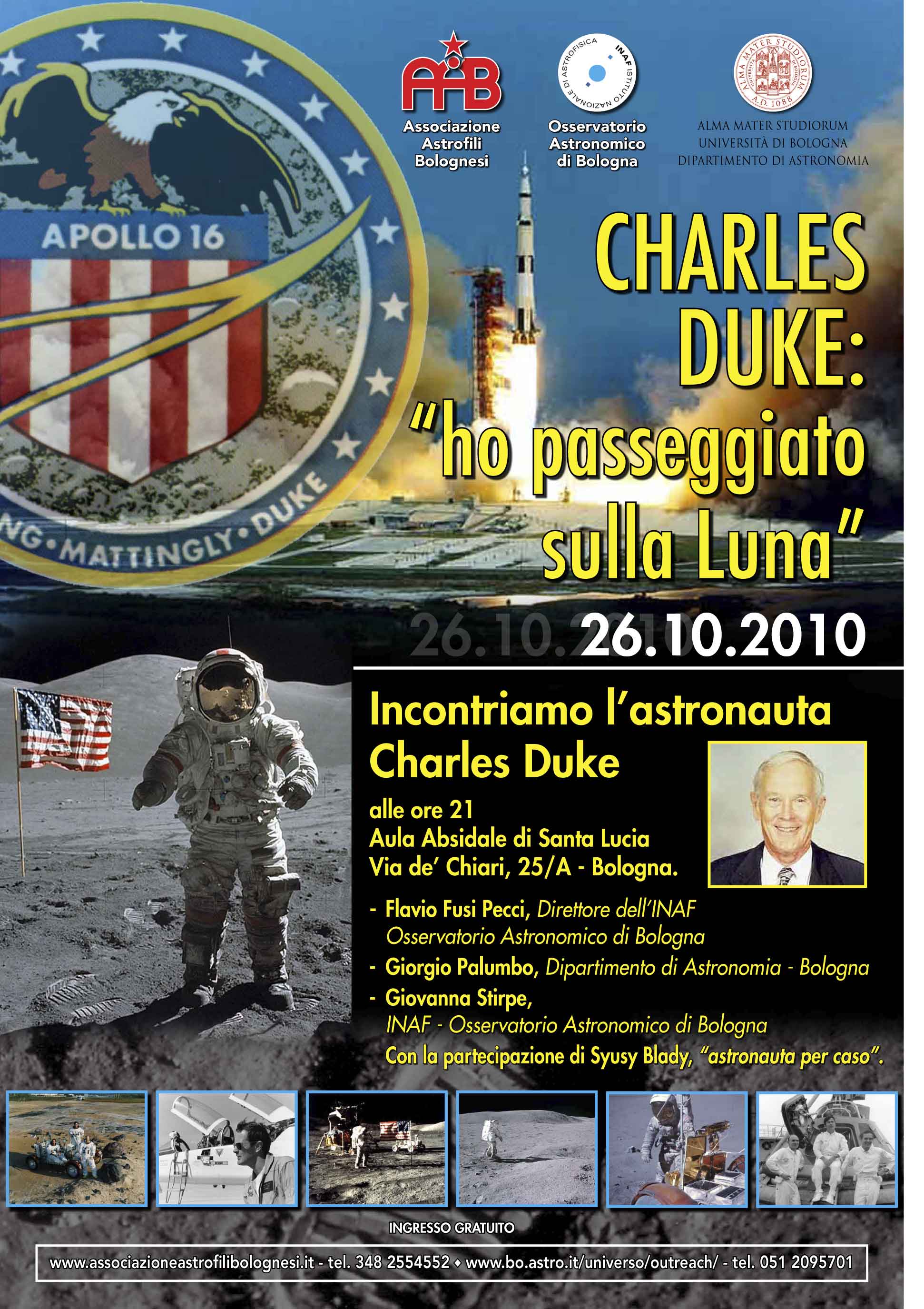 L’appuntamento per la serata, organizzata dall’Associazione Astrofili Bolognesi in collaborazione con l’INAF-Osservatorio Astronomico di Bologna e il Dipartimento di Astronomia dell’Università di Bologna, è per martedì 26 ottobre, alle ore 21, presso l’Aula Absidale di Santa Lucia (via de Chiari 25/A, Bologna). Oltre a Charles Duke e a Suysy Blady, interverranno Flavio Fusi Pecci e Giovanna Stirpe dell’INAF-Osservatorio Astronomico di Bologna, e Giorgio Palumbo, dell’Università di Bologna.