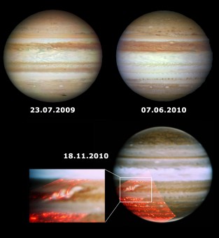 Le metamorfosi della South Equatorial Belt non sono una novità, anzi: tendono ad avere un andamento ciclico. Ogni qualche decina d’anni la SEB diventa completamente bianca per un periodo che va da uno a tre anni. Un cambiamento sul quale gli scienziati si sono interrogati a lungo, e che sembra manifestarsi — per lo meno in modo così intenso e repentino – solo in questa fascia, rendendolo un fenomeno unico per Giove e nell’intero Sistema solare. E variazioni meno appariscenti della luminosità della SEB si verificano con frequenza. Poterle osservare “in azione” offre agli astronomi un’opportunità imperdibile per cercare di comprendere a fondo i fenomeni chimico-fisici dell’atmosfera di Giove, e per mettere meglio a fuoco i quesiti scientifici ai quali la missione spaziale Juno della Nasa, il cui arrivo su Giove è previsto per il 2016, potrebbe dare risposte.