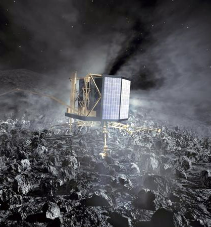 Rappresentazione artistica del lander di Rosetta in azione sulla superficie della cometa Churyumov-Gerasimenko (crediti: NASA)
