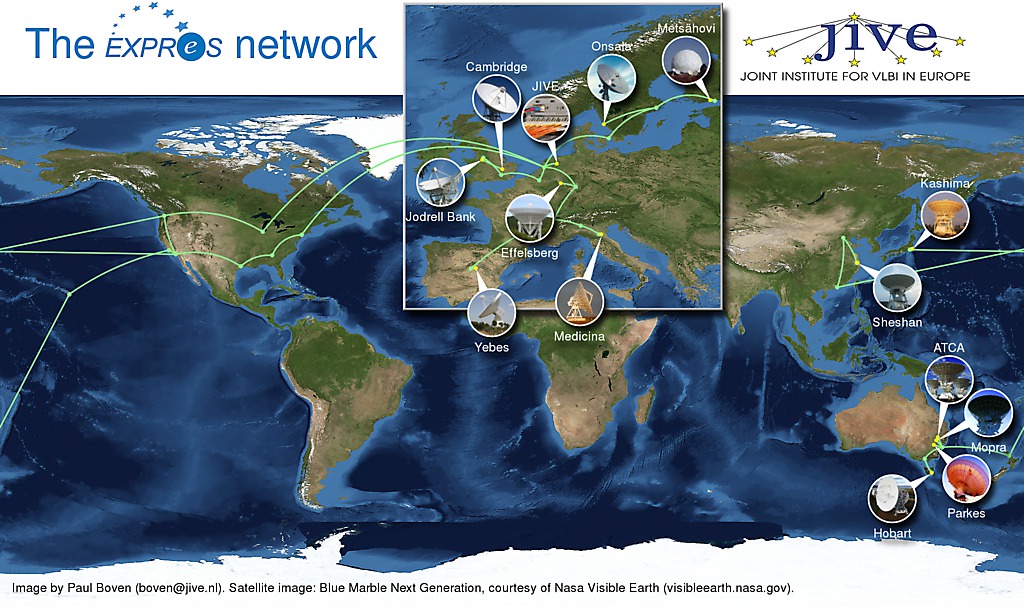 I radiotelescopi utilizzati per l'osservazione simultanea di PMN J0948+0022 e la loro distribuzione geografica, tra Europa, Asia e Oceania (Crediti: Paul Boven/JIVE)