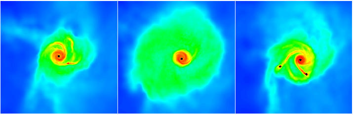 Tre immagini che mostrano il disco intorno a una giovane stella in varie fasi della sua vita iniziale. In rosso, le regioni di gas e polvere più dense, in blu il materiale meno denso e in verde la componente di densità intermedia. Il disco in formazione intorno alla giovane stella (a sinistra) è instabile, come indicato dalla struttura a spirale. Un'esplosione di energia lo stabilizza temporaneamente (al centro), distruggendo la struttura a spirale. Dopo l'esplosione, la stella "s'addormenta" e la spirale ritorna. Alla fine il disco si disgrega formando due stelle di piccola massa (i punti neri a destra).