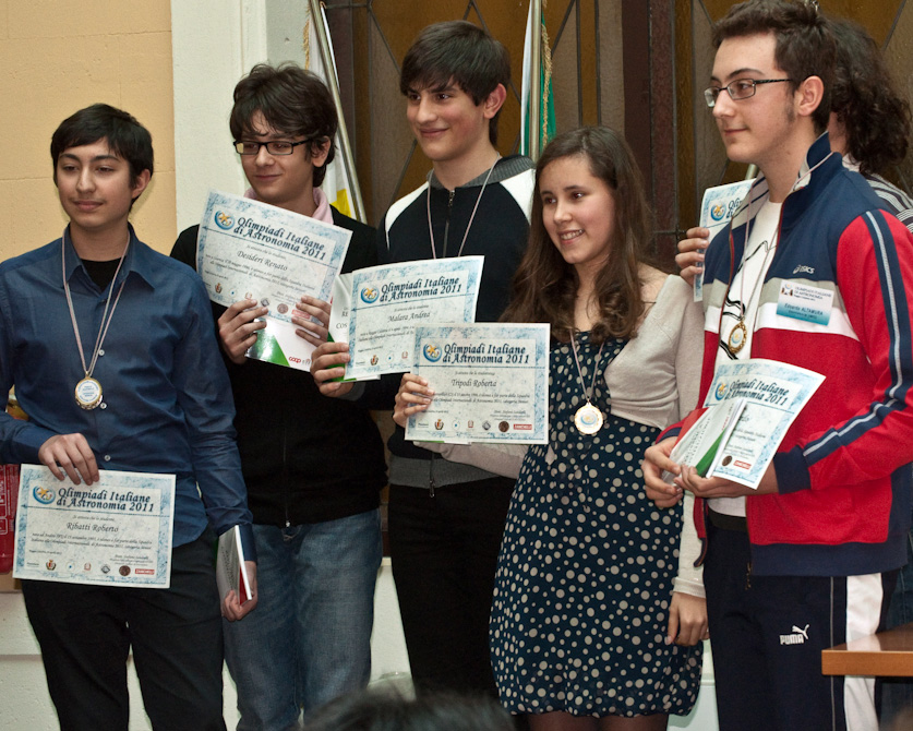Infine, dalla Puglia, e precisamente dal Liceo scientifico Riccardo Nuzzi di Andria, l’argento dell’edizione 2010 Roberto Ribatti, 15 anni. Secondo sul podio degli junior in Crimea, quest’anno cercherà di fare il bis, se non meglio, nella categoria senior. Intanto, ammesso speciale alle finali nazionali in quanto vincitore dell’edizione precedente, nella prova pratica di ieri è riuscito a distinguere una stella variabile da una stella con attorno un pianeta extrasolare.
