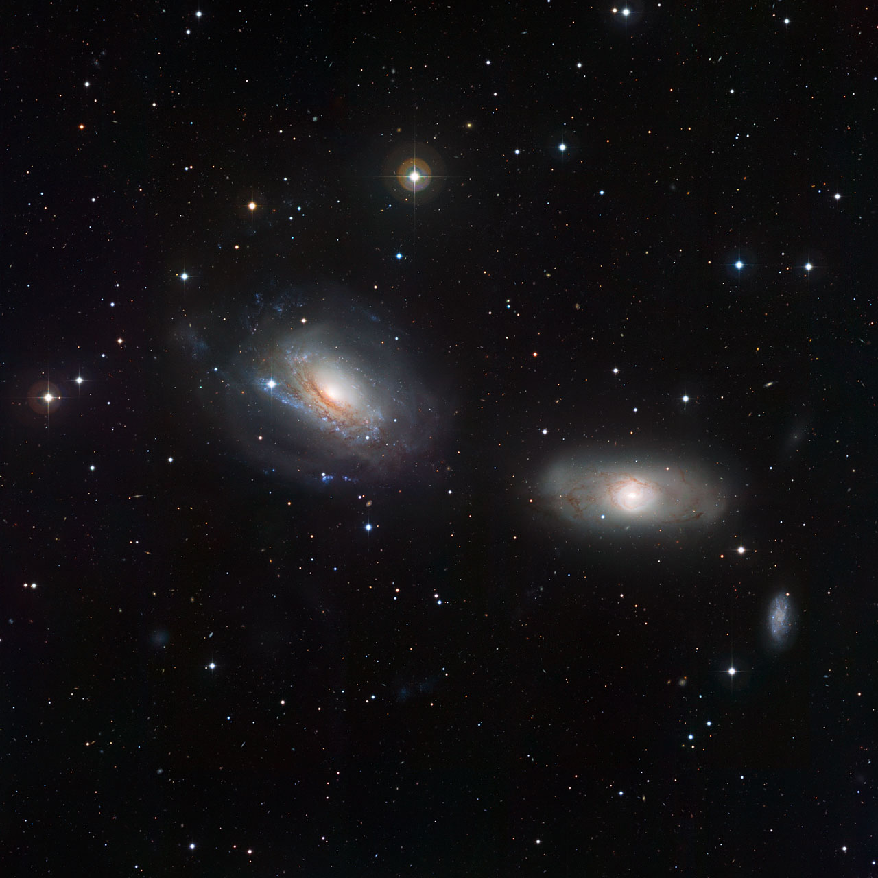 Le galassie, infatti, che formano questa coppia cosmica, riprese dallo strumento WFI (Wide Field Imager) dell’ESO, mostrano tratti curiosi. La coppia è sufficientemente vicina da risentire reciprocamente dell’influsso gravitazionale, che ne distorce la forma.