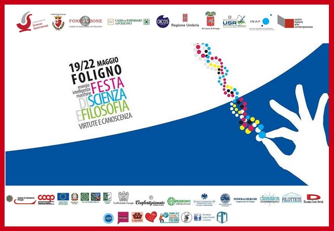 Si apre giovedì 19 la prima edizione del festival della scienza e della filosofia di Foligno. Un evento intorno al quale il comitato promotore della manifestazione, costituito da Pierluigi Mingarelli, Giuseppe Metelli, Maurizio Renzini, Laboratorio di Scienze Sperimentali di Foligno, comune di Foligno, Fondazione Cassa Risparmio di Foligno, Cassa di Risparmio di Foligno S.p.A ed Oicos riflessioni, ha saputo raccogliere tra i principali protagonisti della cultura filosofica e scientifica, ma non solo, del nostro paese.