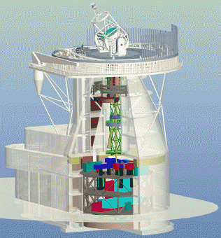 Rappresentazione schematica e visione d'insieme del telescopio EST, in cui sono evidenziati lo specchio primario, il sistema di ottiche e la piattaforma in cui verranno allocati gli strumenti di piano focale. (Crediti: The EST Team)