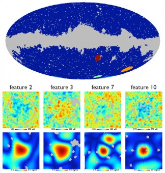 In alto, le quattro feature discoidali individuate dall’algoritmo di Feeney et al. nella mappa di WMAP: la #2 in arancio, la #3 in rosso, la #7 in blu e la #10 in verde. Nei quattro riquadri sottostanti, le feature sovraimpresse ai dati in temperatura (W-band). In basso, per ogni feature, le curve di livello (in sigma) della corrispondente “needlet significance” (uno strumento matematico utilizzato nell’individuazione di pattern all’interno delle mappe)
