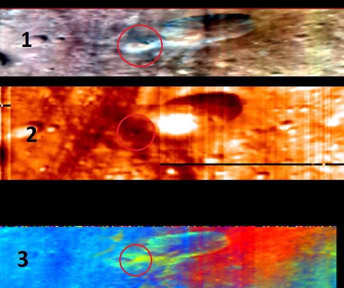 Infine ulteriori informazioni arrivano dalla terza immagine, realizzata in falsi colori per far risaltare le diverse abbondanze di materiali presenti sulla superficie. Qui la zona appare di colore verde, in contrasto con il colore blu circostante. Ciò conferma che deve esserci una forte differenza della composizione chimica poco sotto la superficie, o che quella zona è più giovane rispetto alle regioni che la circondano. Il cerchio si sta quindi chiudendo e nuovi dati ci daranno la risposta definitiva.