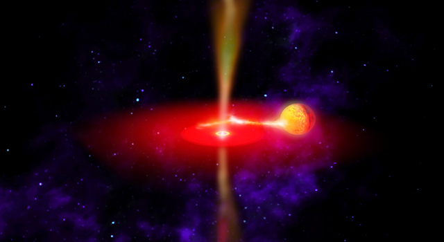 Visione artistica del sistema GX 339-4. Il buco nero centrale strappa il gas della stella compagna che spiraleggiando crea un disco di materia attorno ad esso. Parte di ciò che precipita verso il buco nero viene poi accelerata a velocità prossime a quella della luce nei due getti visibili. (Cortesia NASA)