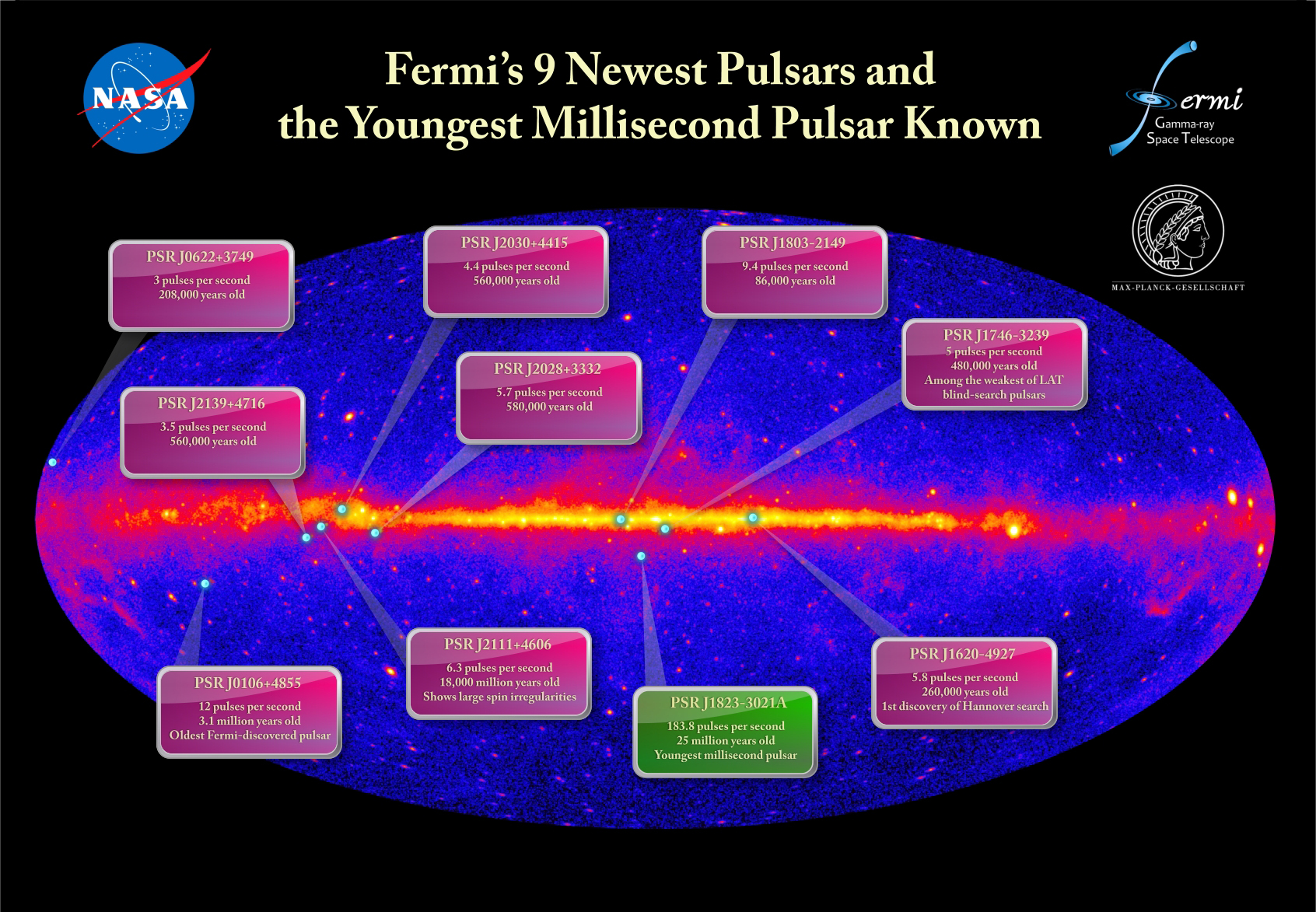 Una sorprendente e potente millisecond pulsar capace di sfidare le teorie esistenti su come si formano questi oggetti cosmici. È la scoperta fatta con il telescopio spaziale Fermi da un team internazionale di scienziati. La ricerca è stata pubblicata sul numero della settimana della rivista scientifica Science. Contemporaneamente un altro team operante su dati del satellite Fermi, ha sviluppato una nuova e più efficiente tecnica di analisi dei dati ottenuti con il satellite della NASA, trovando nove nuove gamma-ray pulsar.