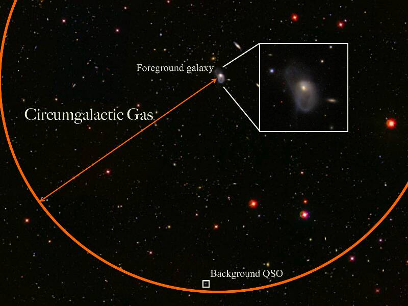 Grazie all strumento Cosmic Origins Spectrograph a bordo del telescopio spaziale Hubble sono stati osservati aloni di gas caldo attorno alle galassie, come quella mostrata nell'immagine dello Sloan Digital Sky Survey. La luce emessa dal gas è invisibile. La sua presenza è rivelata dai colori caratteristici della luce del quasar sullo sfondo assorbita dal materiale in primo piano. (Cortesia Todd M. Tripp, Sloan Digital Sky Survey)