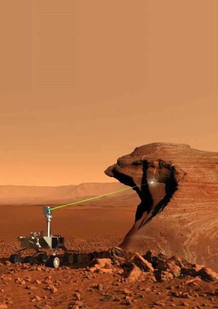 Una rappresentazione grafica di Curiosity mentre vaporizza rocce marziane per poi analizzarle. Crediti: NASA/JPL-Caltech/LANL/J.-L. Lacour, CEA