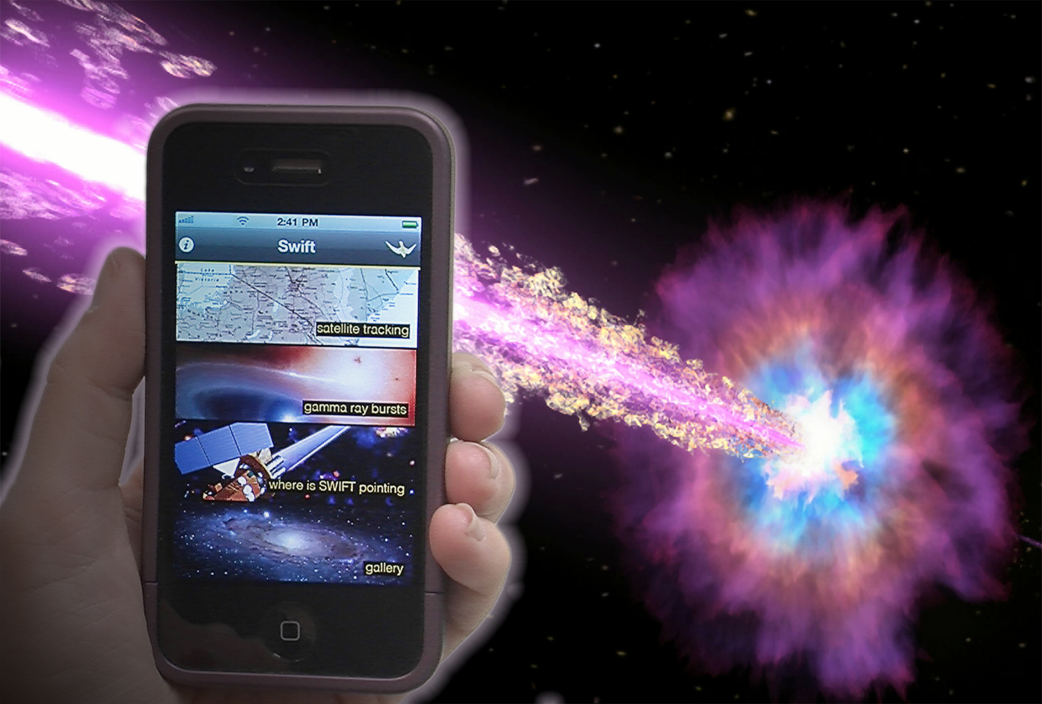 Per il pubblico interessato allo studio di queste incredibili esplosioni è ora disponibile una APP per iPhone, iPad e iPod. La si trova nello APP store digitando Nasa Swift. Oltre a mostrare la posizione attuale del satellite (che si muove in tempo reale), la APP dice dove sta puntando il satellite e fornisce una lista degli ultimi 30 GRB rivelati, dando per ognuno le informazioni gamma, X e ottiche.