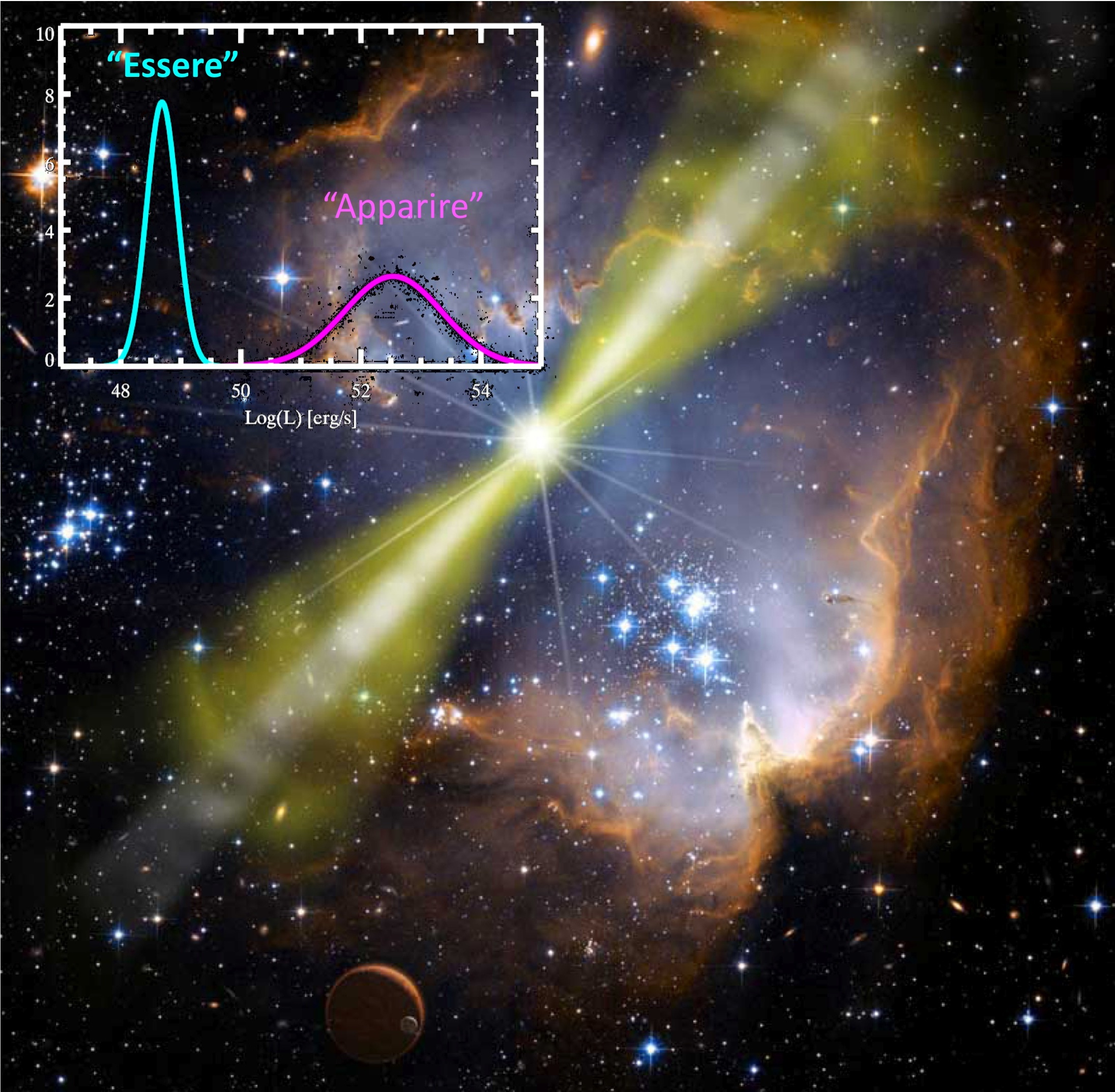 Essere o apparire? Era questa la domanda che da tempo ronzava nella testa di un gruppo di ricercatori italiani. Un quesito tipico di studiosi di filosofia o sociologia, ma in questo caso avanzato da alcuni astrofisici. Quello a cui cercavano di dare una risposta era legato ai lampi di raggi gamma (GRB). Questi eventi, le più potenti e violente esplosioni che avvengono nell’universo, risultano avere caratteristiche molto diverse tra loro. I più energetici GRB sono infatti anche diecimila volte più luminosi rispetto a quelli più deboli. Queste diversità che registriamo sono reali o dovute a fenomeni che ce li fanno sembrare diversi? E quindi la domanda di partenza: i GRB sono così diversi tra loro o ci appaiono tali? Quei ricercatori, dopo un accurato studio, sono arrivati alla conclusione che, in realtà i lampi di raggi gamma potrebbero avere una loro luminosità tipica, praticamente uguale per tutti. Le differenze che noi osserviamo sarebbero dovute alle velocità del gas ionizzato allo stato di plasma emesso durante l’esplosione. I risultati di questo lavoro guidato da un gruppo di ricercatori dell’INAF-Osservatorio Astronomico di Brera sono stati appena pubblicati in un articolo sulla rivista Monthly Notices of the Royal Astronomical Society.