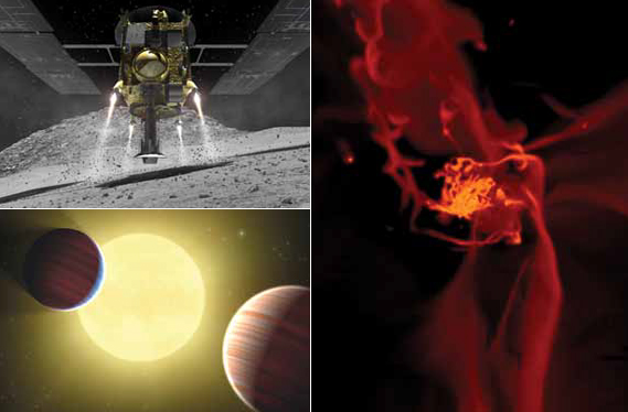 I tre risultati astrofisici nella top ten di Science per il 2011. Dall'alto in senso orario: la sonda giapponese Hayabusa sull'asteroide Itokawa (secondo posto), nubi di gas primordiale (quinto posto) e pianeti extrasolari (ottavo posto). Fonte: Science
