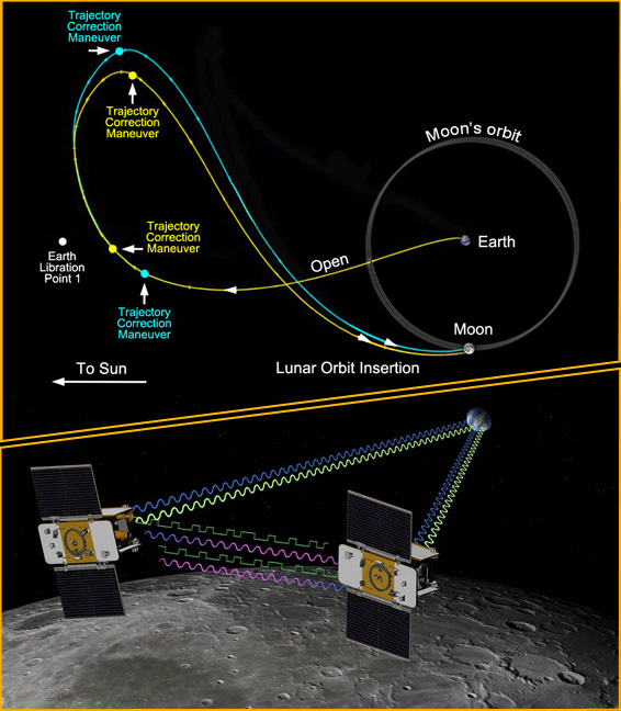 In alto, il lungo tragitto che ha portato le due GRAIL dalla Terra alla Luna. Sotto, le due sonde in azione. Crediti: NASA/JPL