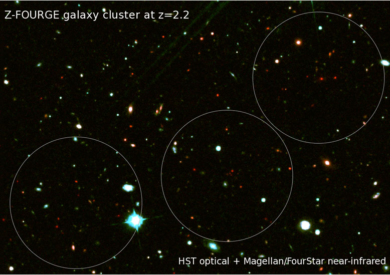 L’ammasso da record è stato scoperto grazie al progetto FourStar Galaxy Evolution Survey (Z-FOURGE) dedicato alla misura sistematica delle distanze degli oggetti celesti. Nei primi sei mesi dall’avvio della campagna osservativa, sono state calcolate su una piccola frazione del campo COSMOS pari a circa un quinto della superficie apparente della luna piena, le distanze di un migliaio di galassie, alcune delle quali ancora più lontane di quelle dell’ammasso a 10,5 miliardi di anni luce. “L’eccellente qualità delle immagini e la sensibilità offerta dall’accoppiata di Magellan e FourStar fa davvero la differenza” commenta Ivo Labbé, Principal Investigator di Z-FOURGE e coautore dell’articolo. “Non vediamo l’ora di fare tante altre eccitanti e inattese scoperte!”.