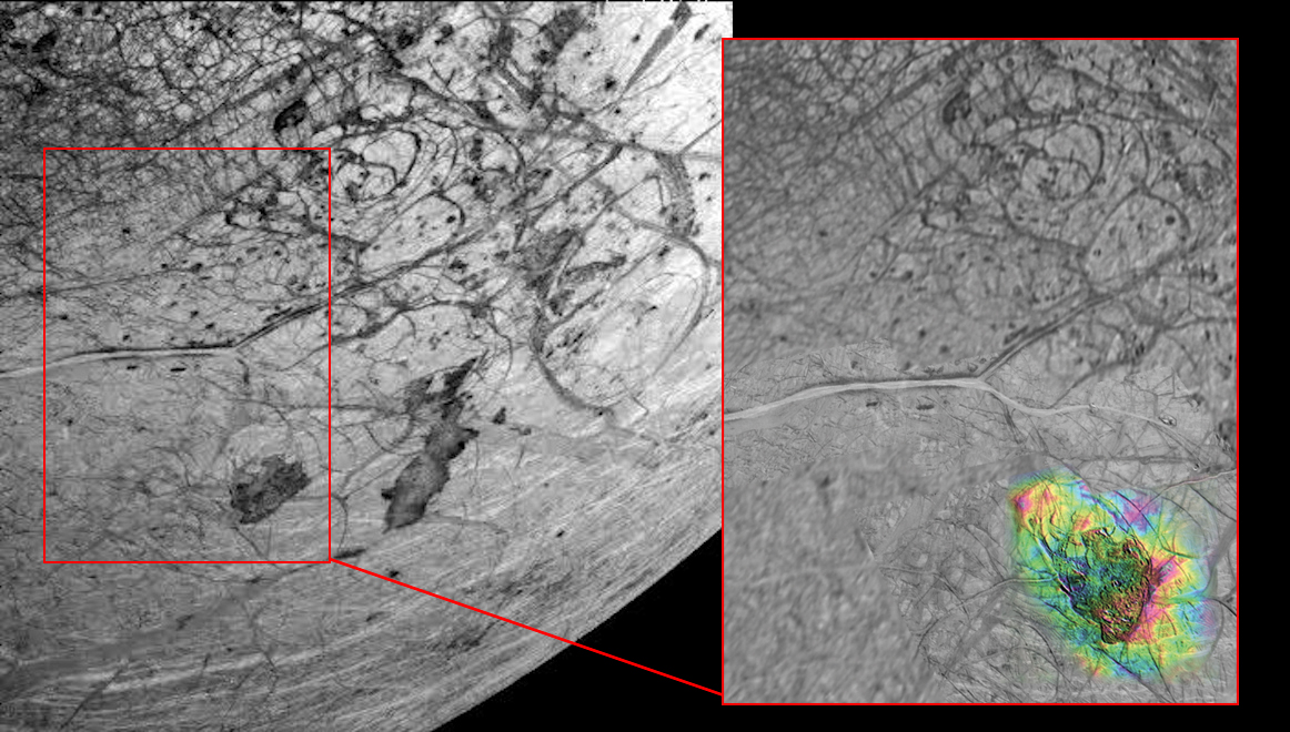 Dall’immagine emerge l’esistenza di una zona di forma circolare, chiamata Macula Thera, di dimensione pari ai grandi laghi del nord America, circa 400/600 metri più depressa del terreno circostante. Una zona che presenta una superficie irregolare, per questo chiamata “cahotic terrain”, terreno caotico, molto diversa dal tipico aspetto della superficie ghiacciata del satellite, liscia e percorsa da crepe.