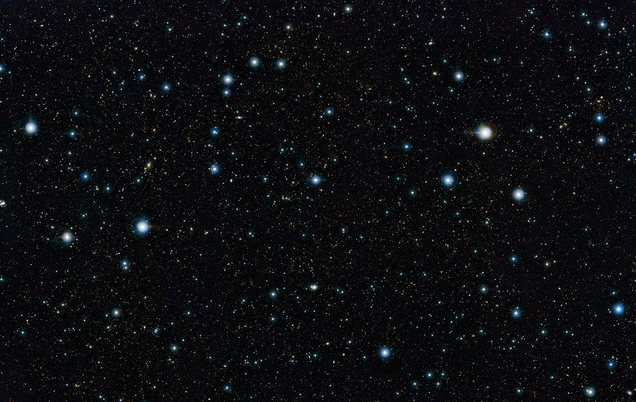 Ad un primo approccio le immagini di UltraVISTA possono apparire insignificanti: alcune stelle brillanti e una spruzzata di stelle più deboli. In realtà, quasi tutti gli oggetti deboli non sono stelle della nostra Via Lattea, ma galassie remote, ciascuna composta da miliardi di stelle. Ingrandendo l’immagine sempre di più, fino a riempire lo schermo e oltre, se ne vedono in numero sempre maggiore, fino a contarne oltre 200 mila.