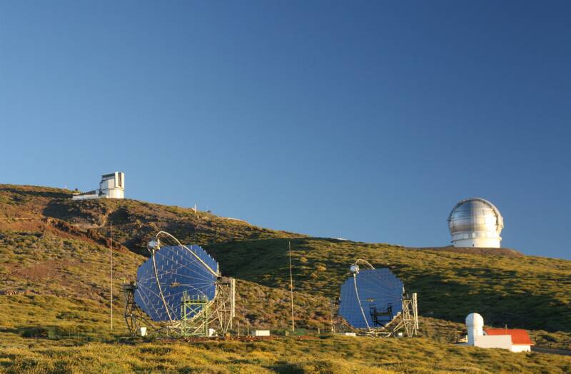 In primo piano, i due telescopi MAGIC installati sull'isola di La Palma alle Canarie. Sullo sfondo, in alto a sinistra il Telescopio Nazionale Galileo dell'INAF e a destra il Gran Telescopio Canarias. Crediti: R. Wagner, Max Planck-Institut fur Physics
