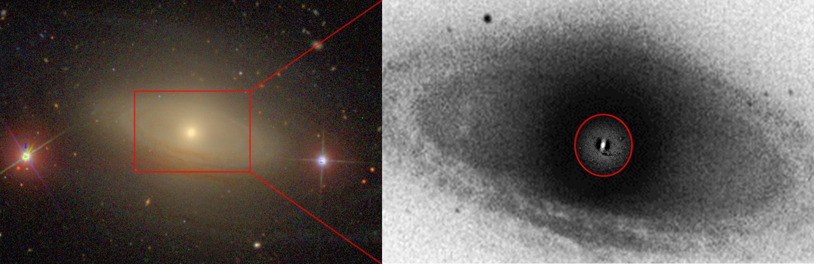 Due immagini di NGC 4698 tratte dalla “Sloan Digital Sky Survey” (a sinistra) e dal "Carnegie Atlas of Galaxies" (a destra). Quest'ultima evidenzia la particolare forma del rigonfiamento centrale, che si allunga in direzione ortogonale rispetto al disco. Nel cerchio centrale è inserita un'immagine ottenuta con l'Hubble Space Telescope, opportunamente elaborata per evidenziare la presenza del disco nucleare. Crediti: L. Morelli, Università di Padova.